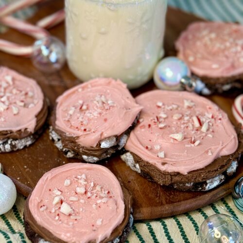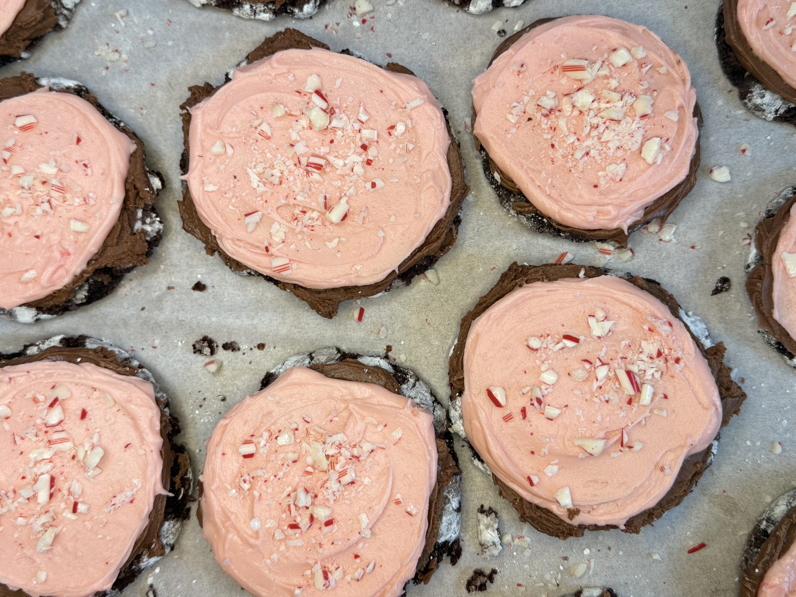 - Once the cookies are completely cool, frost each cookie first with the chocolate frosting (this can be a thin layer). Then, add a dollop or swirl of the pink peppermint frosting on top. Immediately sprinkle generously with crushed candy canes before the frosting sets.